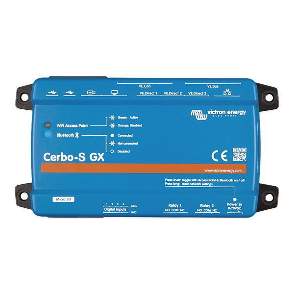 Este centro de comunicaciones le permite tener un perfecto control de su sistema en todo momento y desde cualquier lugar para maximizar su rendimiento. Solo tiene que acceder a su sistema con nuestro portal Victron Remote Management (VRM) o directamente con la pantalla GX Touch 50 opcional, una pantalla multifuncional o la aplicación VictronConnect, gracias a su opción de Bluetooth.